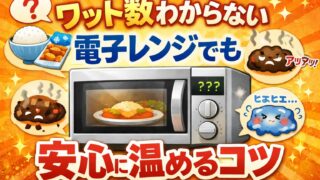 電子レンジを使おうとしたとき、「ワット数がわからない」「何分温めればいいのか不安」と感じたことはありませんか。 説明書が見当たらなかったり、譲り受けた電子レンジだったりすると、加熱時間の判断に迷ってしまいがちです。 その結果、温めすぎて固く...