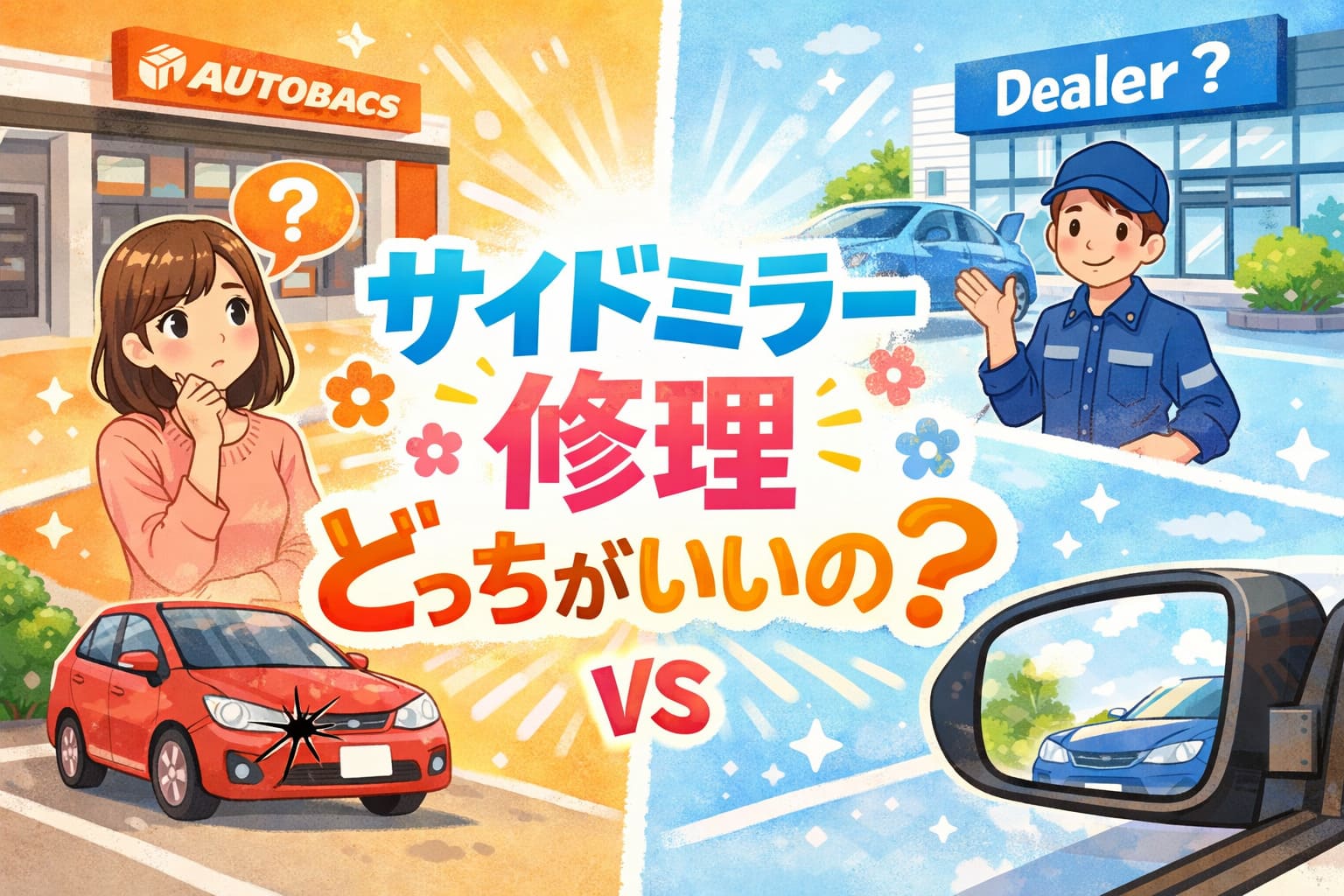 早く・安く直したいならオートバックス、安心・品質を重視するならディーラーという考え方をベースにすると判断しやすくなります。